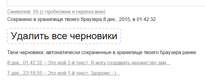Список всех твоих черновиков доступен снизу под текстовой областью, в любое время и только для твоего устройства. Каждый черновик (в списке черновиков) имеет «дату последнего изменения», чтобы легко идентифицировать черновик.